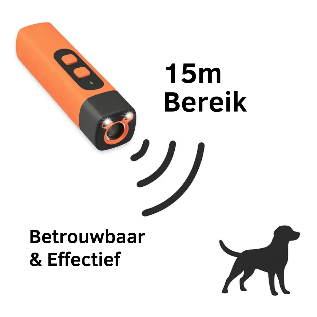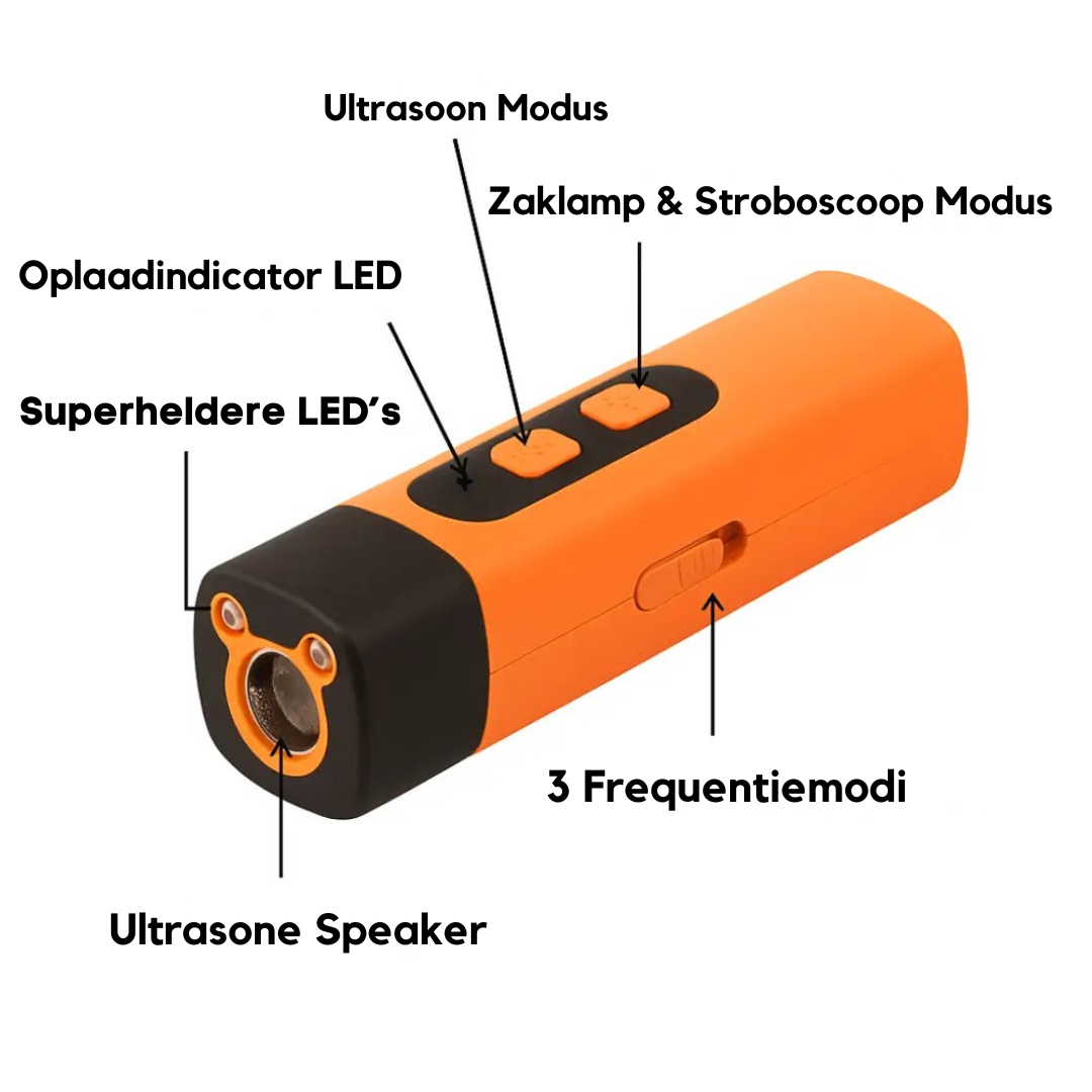 Het Anti-blaf apparaat combineert ultrasoon geluid, zaklamp & stroboscoop, 3 frequentiemodi en superheldere LED’s in één compacte tool. Hiermee stop je ongewenst gedrag snel en veilig, terwijl je altijd controle behoudt.