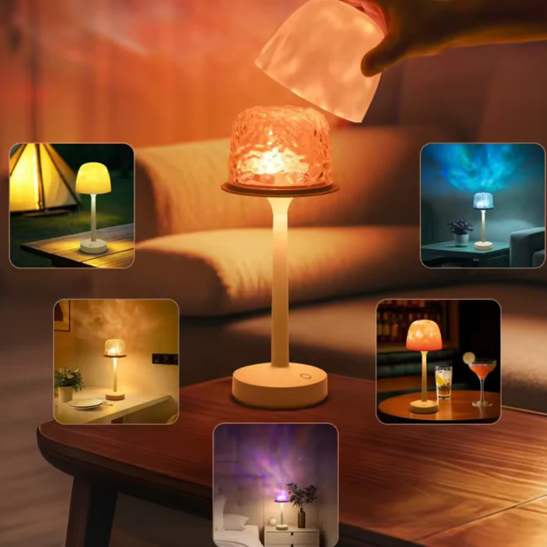 De AuraGlow Sfeerlampje is een decoratieve lamp die dynamische lichtpatronen projecteert om een gezellige sfeer te creëren.
