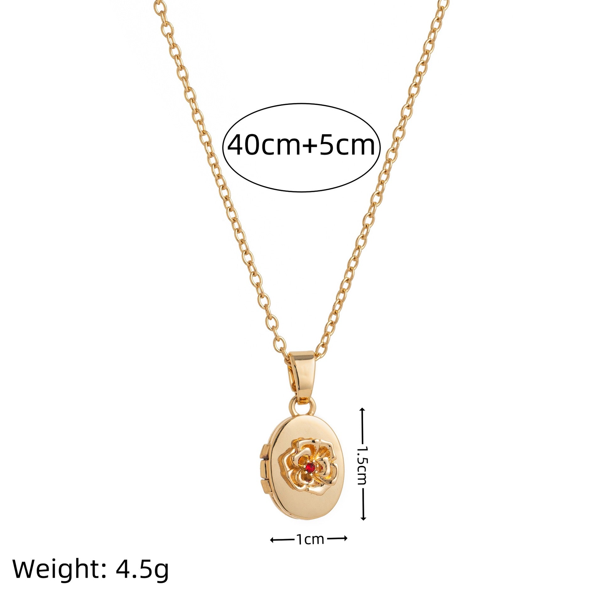 The pendant measures 1.5 cm in height and 1 cm in width, hanging on a 40 cm chain with a 5 cm extender for the perfect fit.