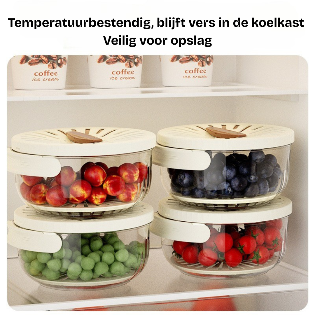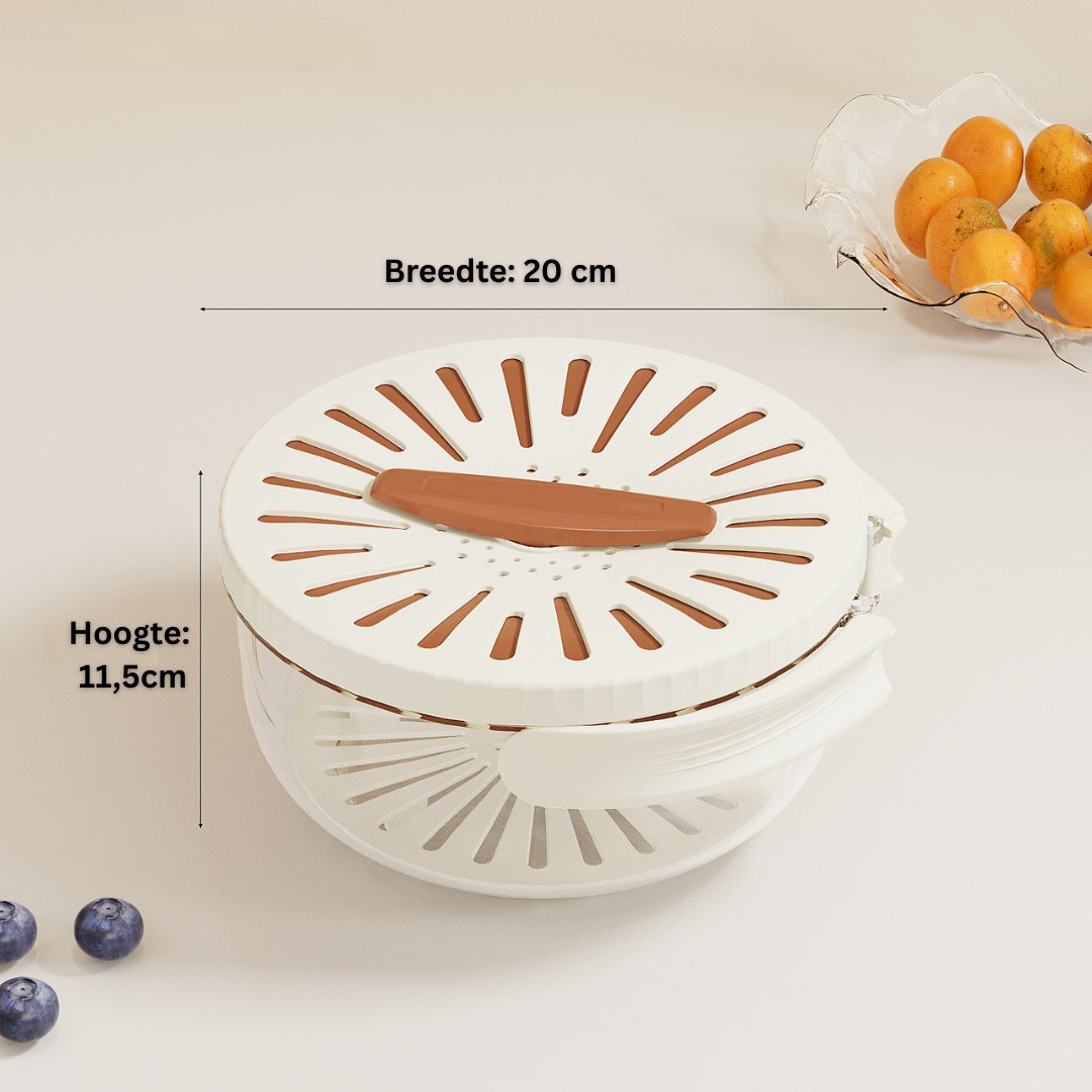 Het is een 2-in-1 keukengadget dat dienstdoet als vergiet en bewaardoos tegelijk, zodat je groenten en fruit kunt wassen, afgieten en bewaren in één handig apparaat.