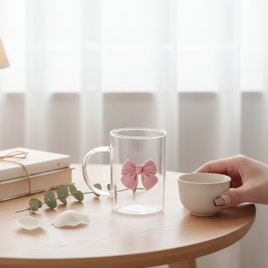 De Glazen Mok met Strik voegt moeiteloos elegantie toe aan elk drankje. Haar roze strik en stijlvolle ontwerp maken elke slok een charmant moment.