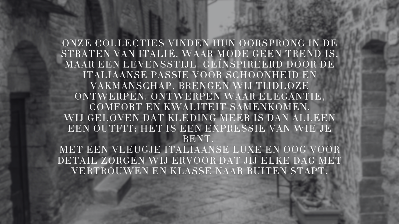 Bij ons draait alles om tijdloze elegantie en verfijning, geïnspireerd door de rijke Italiaanse modecultuur. Met oog voor detail en vakmanschap selecteren we collecties die luxe en comfort samenbrengen.