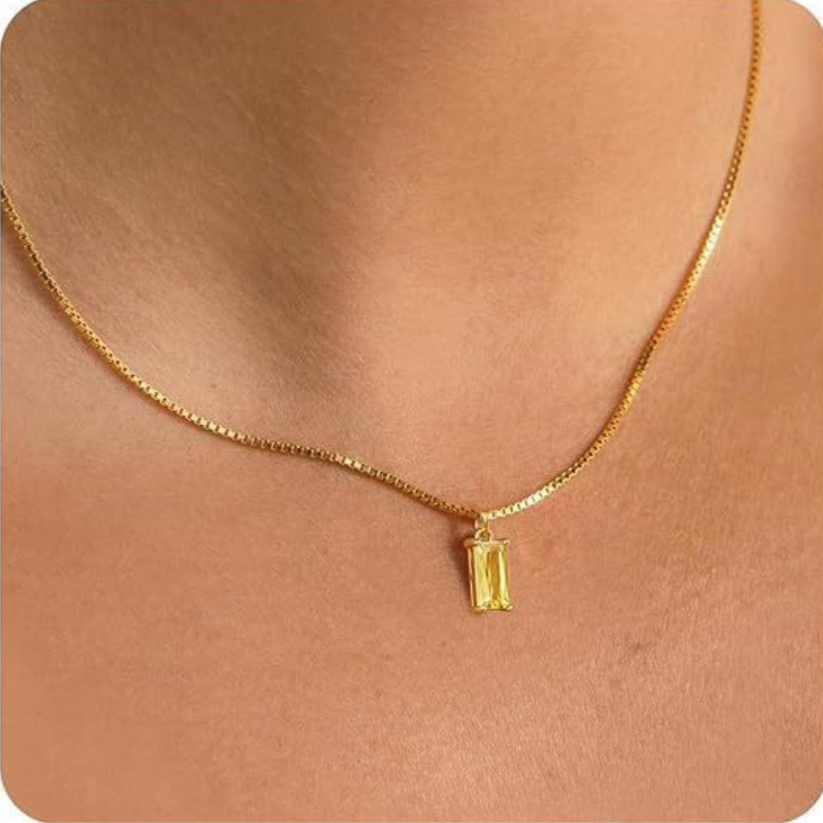 The Valoria Birthstone Necklace is a timeless expression of elegance and personal meaning. Featuring a refined rectangular-cut stone, this minimalist necklace is available in the color of your birth month, making it a subtle yet powerful symbol of individuality and connection.